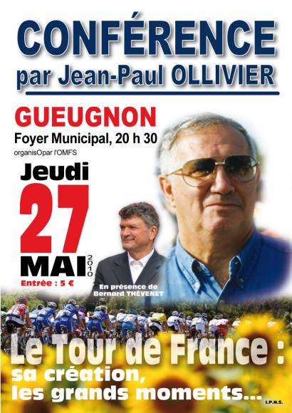 Jean-Paul Ollivier est un grand journaliste sportif, spécialiste de l’histoire du cyclisme et des biographies des champions. Bernard Thevenet, c’est un de ces champions, double vainqueur du Tour de France et bourguignon qui plus est ! Cette soirée, appuyée par des vidéos, sera donc animée dans un premier temps par Jean-Paul Ollivier qui abordera la création du Tour de France, ses grands moments, la gloire et la malchance de certains concurrents et d’autres thèmes bien ciblés. Dans un second temps, place au coureur Bernard Thevenet qui présentera sa carrière et sa vie. Rendez-vous jeudi 27 mai à 20h30 au foyer municipal. Tarif : 5€