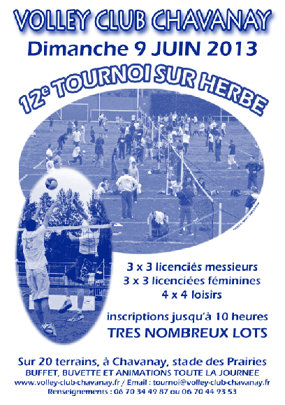 Comme chaque année, le Volley Club de Chavanay(42) organise son grand tournoi sur herbe au stade des prairies, qui se déroulera cette année le Dimanche 9 juin 2013.